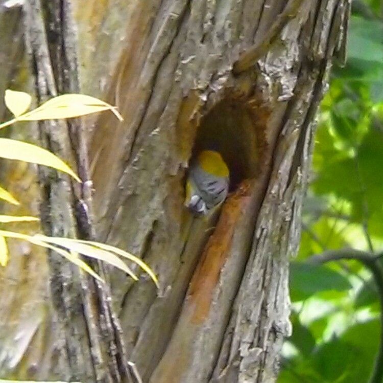One bird that I've been hearing continuously over the past few weeks is the Prothonotary Warbler, a tiny golden bird that is notable for being the only warbler that nests in cavities. Today, I found the nest in an old cedar that looks like it broke off at the top. The male bird was bringing food into the hole, so either he was feeding the female or he was feeding the young. My guess is that he was feeding the female, since I didn't see her and I didn't hear any begging nestlings.